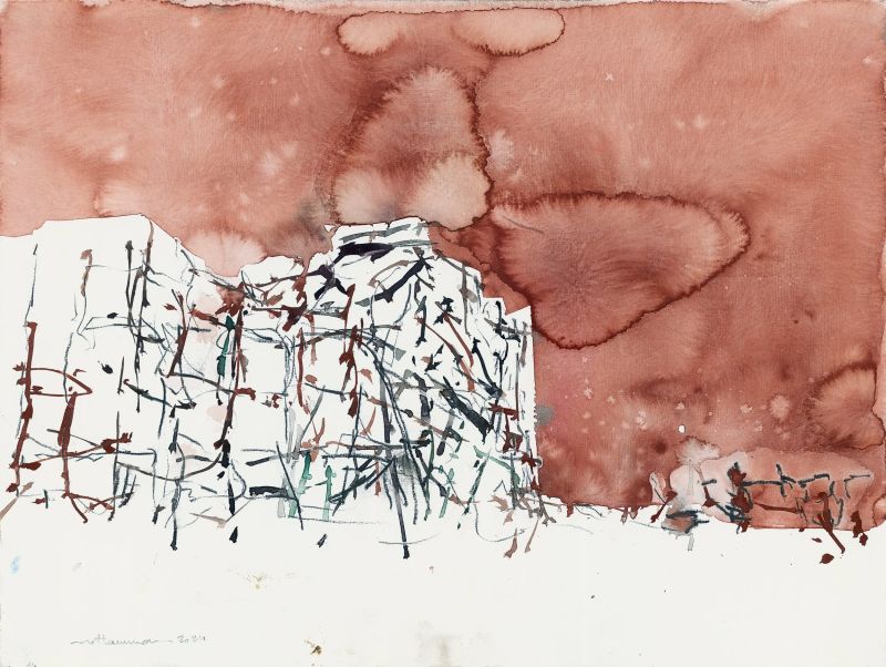 Illustration : Tammam Azzam, Aquarelle on fine art paper 36×48 cm, œuvre issue de la série « Aftermath », 2024.